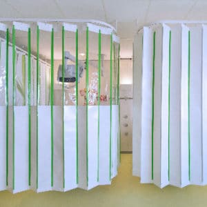 Cette innovation, radicale, bio-nettoyable se décline en paravents de chambre double et en box pour SSPI, extubation, services d’urgences (version du sol au plafond avec fenêtres de surveillances possible) pour la reprise des activités des services à 100% en conformité avec les nouvelles recommandations des ARS.
